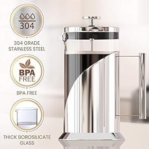 304 Grade Stainless Steel French Press: Rust and corrosion resistant 304 grade stainless steel is the cornerstone of our french coffee press. The carafe housing, filtration system, handle, and top lid are all designed to last a lifetime and create a coffee french press that looks amazing in your kitchen. The french press stainless steel is super durable, so feel comfortable taking it with you while on the go