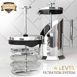 4 Level Filtration System: Brewing coffee is an art form requiring a superior filtration system. At Cafe Du Chateau, we created a 4 level system for our coffee press that keeps grounds out of your delicious brew. Consisting of two stainless steel screens, a spring loaded base for sealing the edges while pressing, and a lid strainer to trap grounds. Our system ensures you will be brewing like a barista on day one