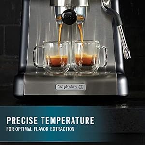 The Calphalon temp IQ espresso machine with steam wand features thermoblock heating technology and PID temperature control to evenly heat during the espresso extraction, and pre-infusion to bloom the espresso grounds for optimally extracted espresso. With conveniences like steam wand, auto-shot volumetric control, and cup warming tray, You can experience consistently delicious espresso at home.Includes stainless steel milk pitcher, tamper,and cleaning pin.