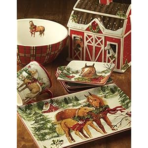 Travel to the farm for the holidays with Certified International’s ceramic dinnerware and serveware items . Each piece features beautiful horses in a snowy field decked out in holiday wreaths, their red barn in the distance. Designed by Susan Winget based on her own horses. Plaid accents and colorful red barn 3-d items along with a playful horse S&P set complete this delightful collection.