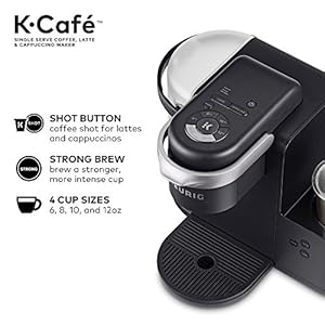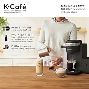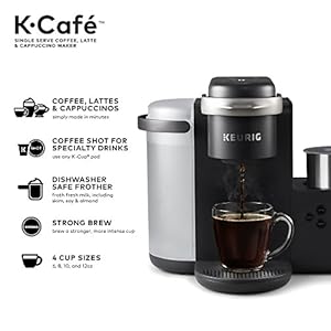 Enjoy the rich, full-flavored coffee you love or delicious coffeehouse beverages from the new Keurig K-Café single serve coffee, latte, and cappuccino maker. Whether brewing coffee, or making lattes, and cappuccinos, the K-Café brewer works with any K-Cup pod so the options are endless. Use the coffee SHOT to brew a concentrated shot of coffee and froth your choice of fresh milk to create a creamy latte or frothy cappuccino. Enjoy your latte or cappuccino hot or use the COLD setting for cold frothed milk to make a wonderfully refreshing iced latte or iced cappuccino. Brew 6, 8, 10, or 12oz of your favorite coffee, tea, or cocoa – select Strong Brew when you want a bolder cup of coffee. The dishwasher safe frother makes clean up a breeze – enjoying delicious specialty beverages at home has never been so easy. Just brew, froth, enjoy! Making a latte or cappuccino in just 3 easy steps: 1. BREW a coffee SHOT using any K-Cup pod. 2. FROTH your choice of fresh milk, including skim, soy, and almond in the dishwasher-safe frother. 3. ENJOY your creamy latte or frothy cappuccino. DISHWASHER SAFE FROTHER: Froth fresh milk, including skim, soy, and almond. The frother is dishwasher safe for easy clean up after use and also features a COLD setting for cold frothed milk.